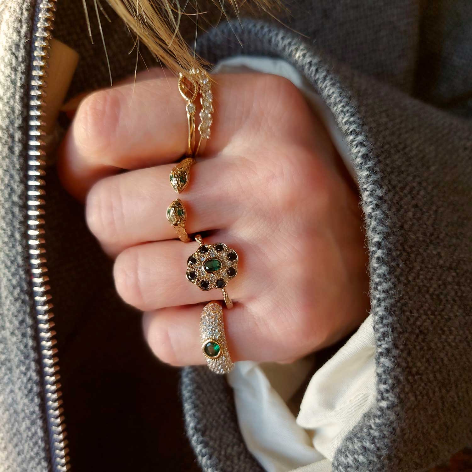 La bague Anna séduit par son motif floral délicatement travaillé. Son anneau finement texturé soutient une composition circulaire où la pierre couleur émeraude centrale capte la lumière avec intensité. Autour d’elle, un pavage d’oxydes de zirconium crée un jeu d’éclat subtil et raffiné.