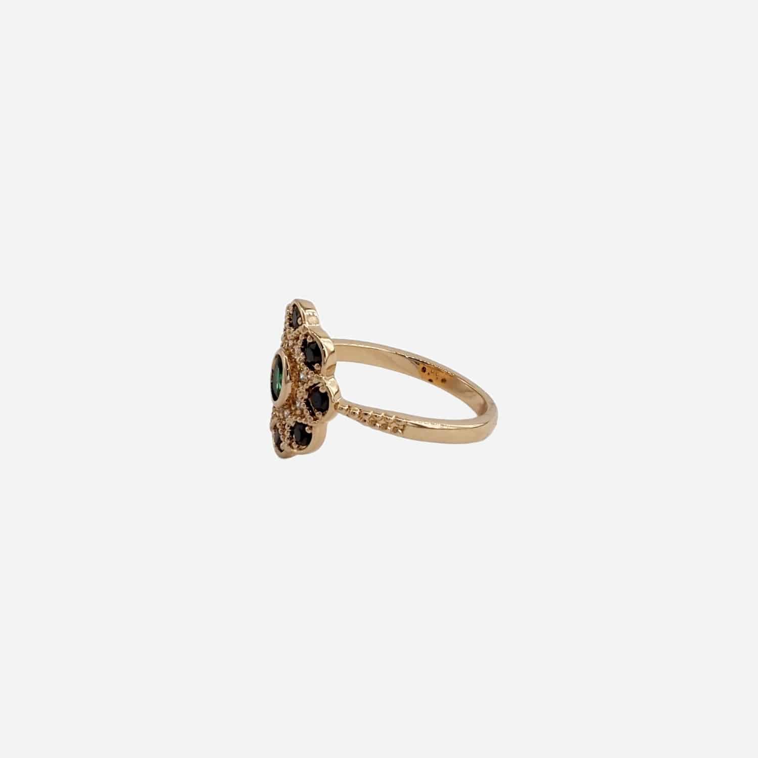 La bague Anna couleur émeraude illumine la main avec sa pierre centrale éclatante entourée d’un halo délicat de zircons. Son design floral vintage et sa finition plaqué or 18 carats en font un bijou à la fois raffiné, féminin et intemporel.