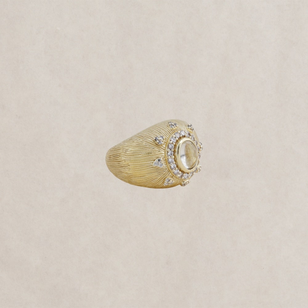 La bague « Cyclamen » de Diaperis est une pièce précieuse en plaqué or, sublimée par des pierres naturelles d’Améthyste verte et des zircons étincelants. Son design arrondi et strié ajoute une touche de sophistication à ce bijou unique. Les pierres Améthyste verte, aux teintes profondes et envoûtantes, varient légèrement selon la lumière, rendant chaque bague véritablement exclusive. Les zircons apportent un éclat supplémentaire, faisant de la bague « Cyclamen » un choix parfait pour les amateurs de bijoux élégants et raffinés. Ce bijou, à la fois intemporel et moderne, s’adapte à toutes les occasions, du quotidien aux événements spéciaux.