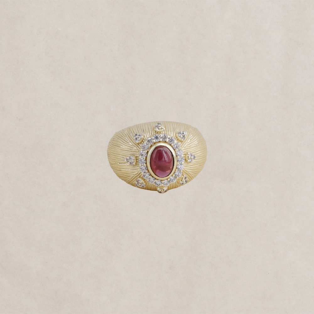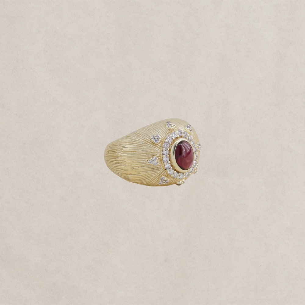 La bague « Cyclamen » de Diaperis est une pièce précieuse en plaqué or, sublimée par des pierres naturelles de grenat et des zircons étincelants. Son design arrondi et strié ajoute une touche de sophistication à ce bijou unique. Les pierres de grenat, aux teintes profondes et envoûtantes, varient légèrement selon la lumière, rendant chaque bague véritablement exclusive. Les zircons apportent un éclat supplémentaire, faisant de la bague « Cyclamen » un choix parfait pour les amateurs de bijoux élégants et raffinés. Ce bijou, à la fois intemporel et moderne, s’adapte à toutes les occasions, du quotidien aux événements spéciaux.