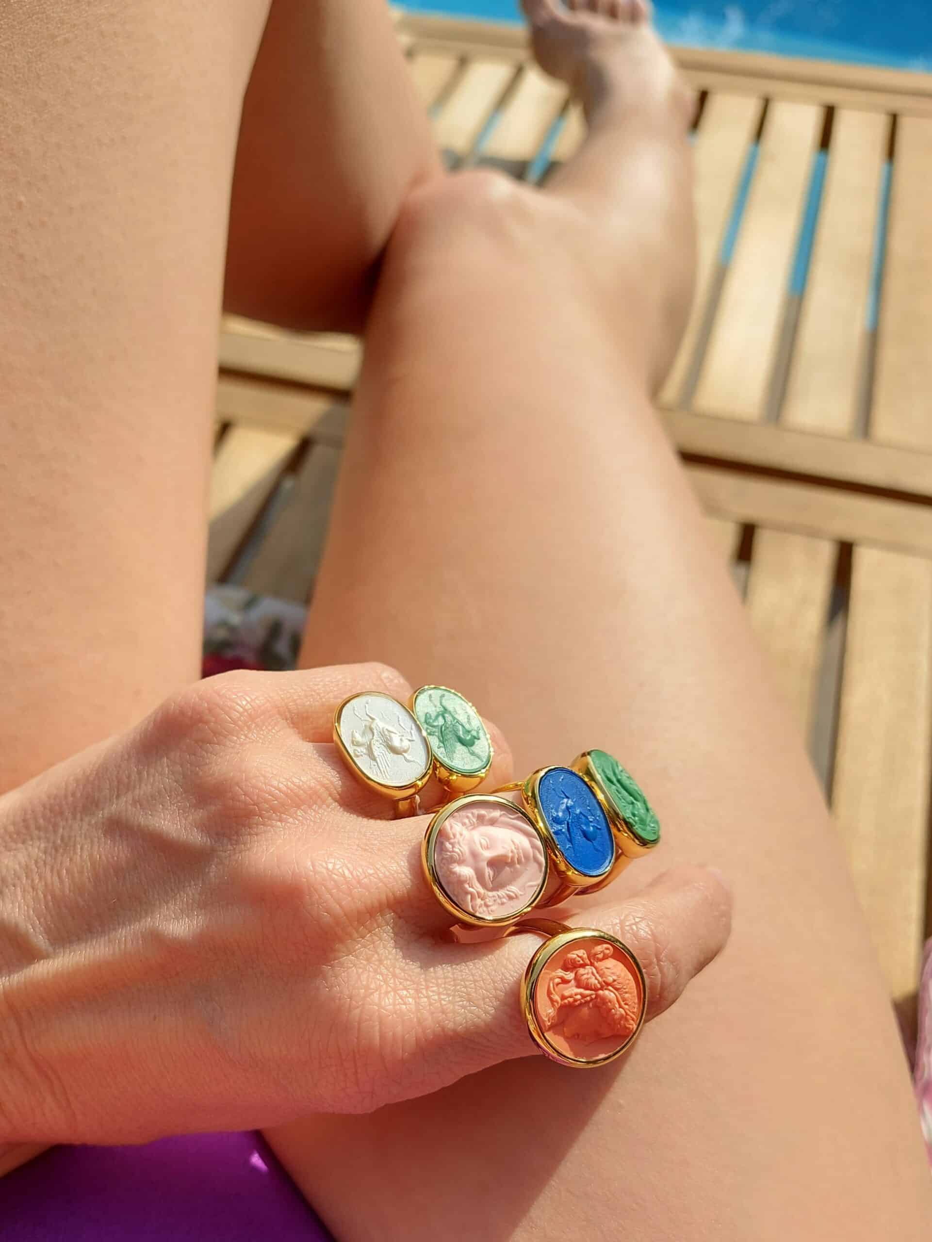 La bague en bronze plaqué or 18 carats avec un plateau en résine de couleur. Avec des détails magnifiques de la fresque Leda and the Swan. L’histoire de cette fresque, représente l’amour entre Leda et Zeus, qui prit la forme d’un cygne pour la séduire.