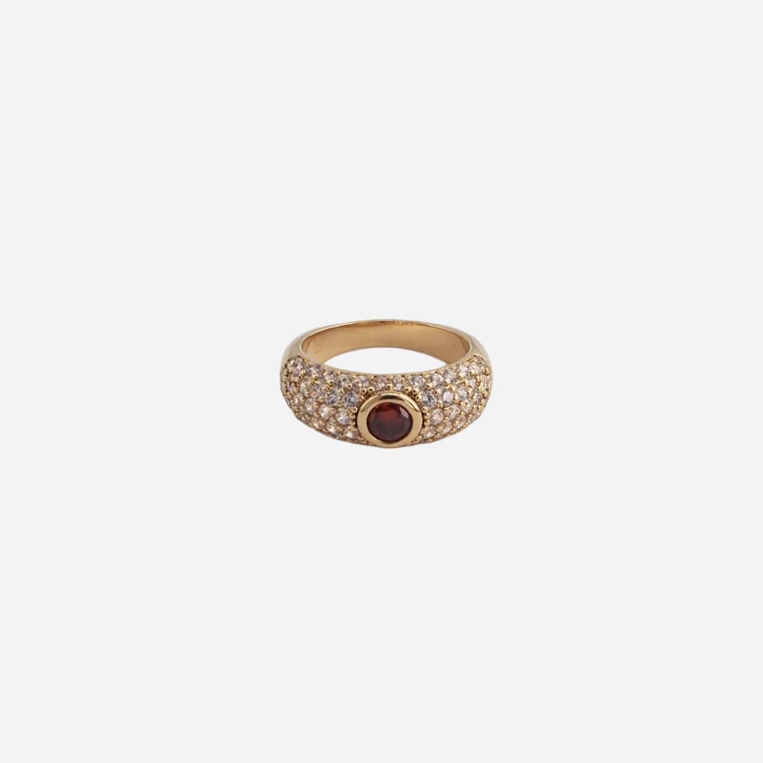 Ce jeu entre éclat cristallin et couleur grenat intense évoque l’esthétique des bijoux anciens revisités dans une version moderne. Son anneau large lui confère une présence forte tout en restant élégante.
