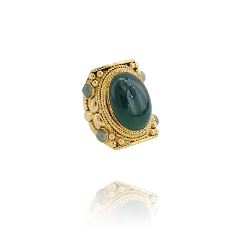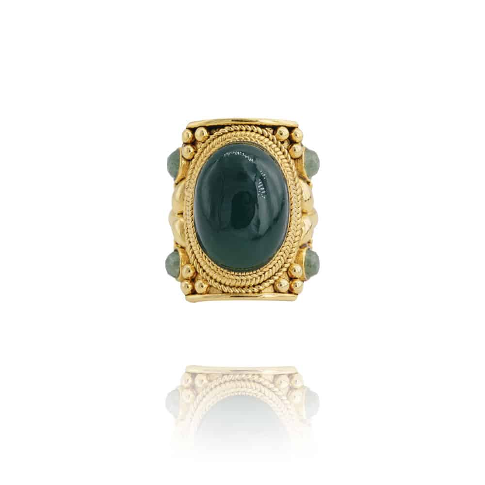 Celle-ci sûre qu’elle va devenir votre chouchoute ! Bague réglable en plaqué or 3 microns et sa magique pierre en agate verte au centre accompagnée de cabochons en aventurine.