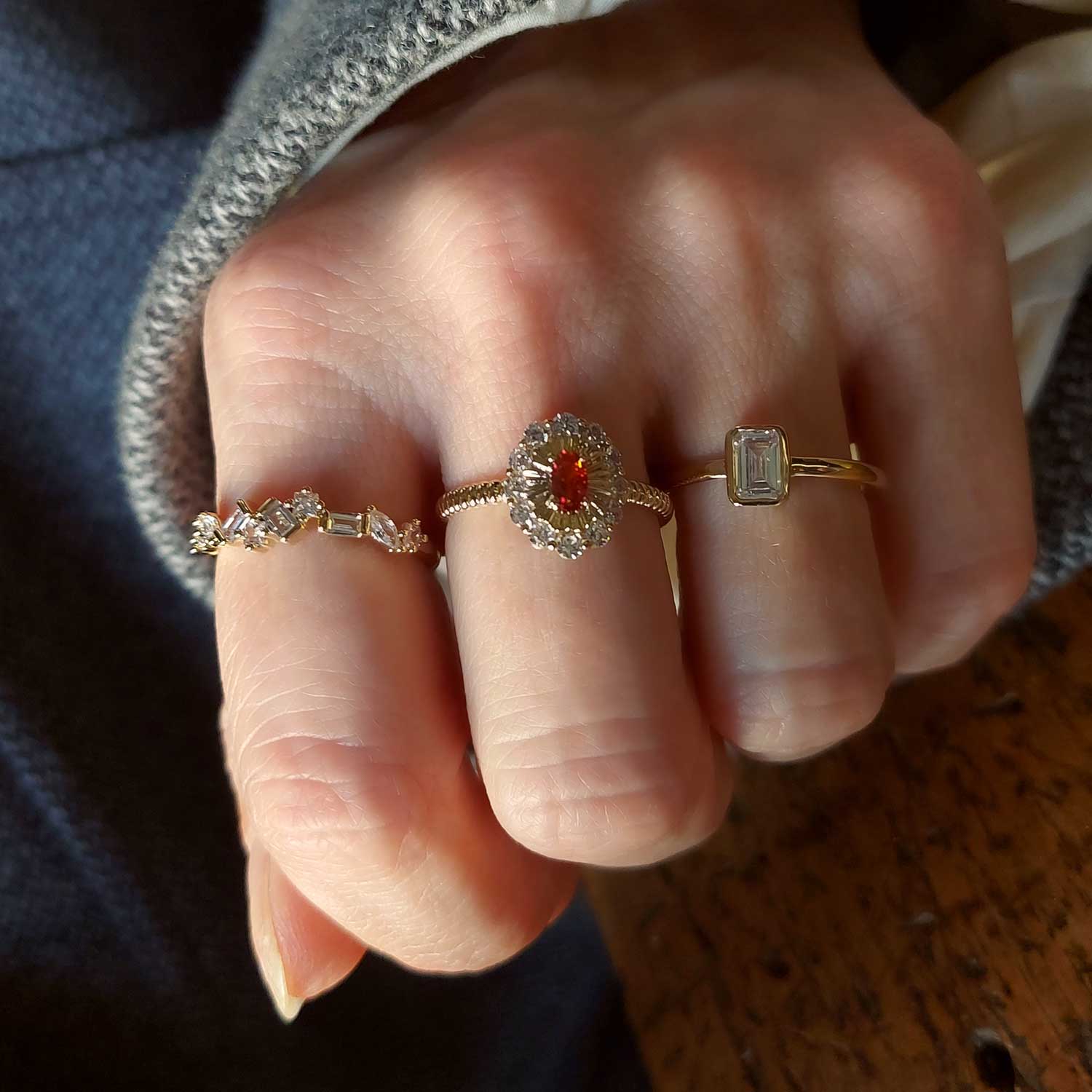 La bague Léonore séduit par son jeu de volumes et de lumières. Les zircons taille baguette, aux lignes droites et modernes, contrastent délicatement avec les pierres rondes plus classiques. Ce rythme graphique crée une silhouette élégante, presque joaillière.