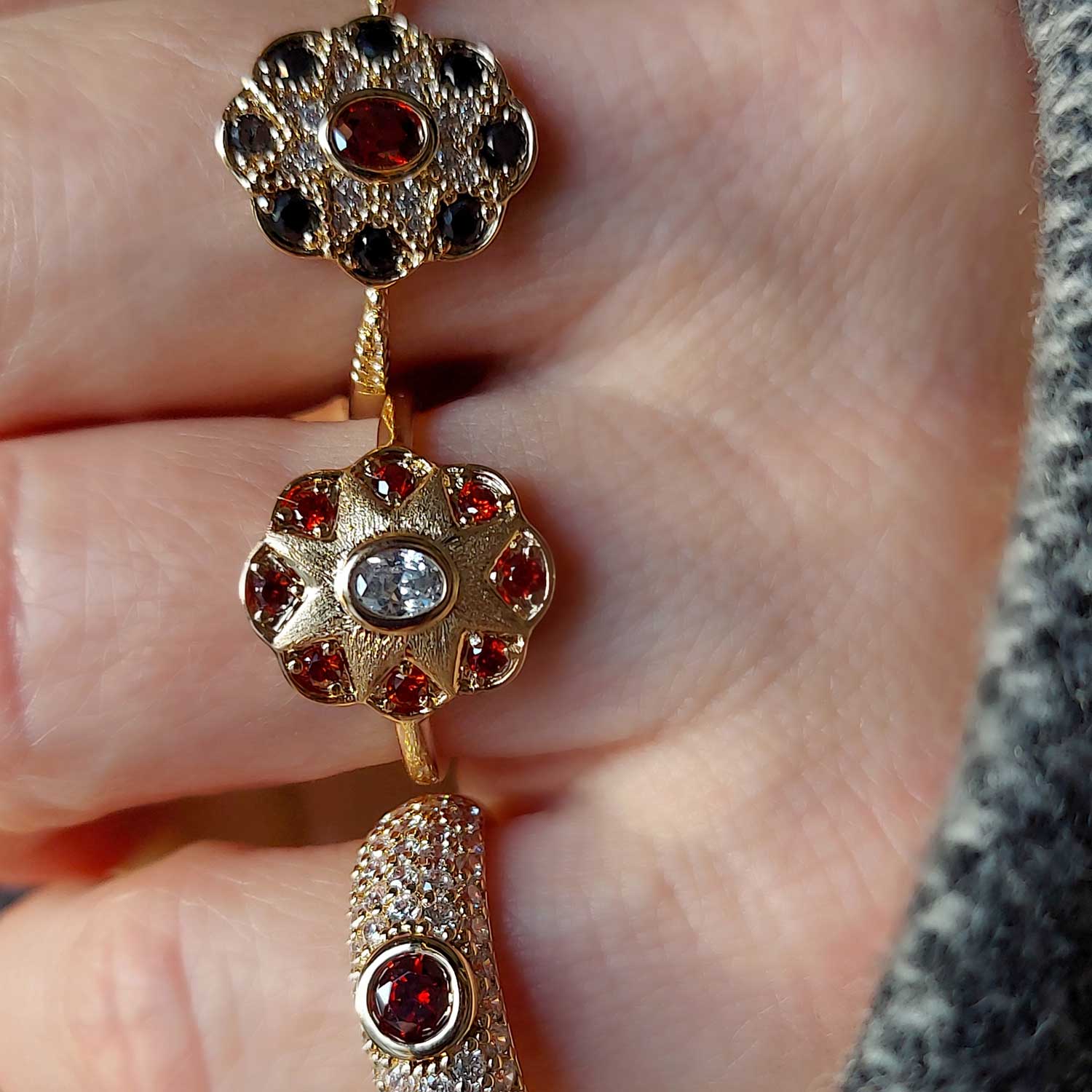 – Pierres : Oxydes de zirconium rouges + zircon central transparent
