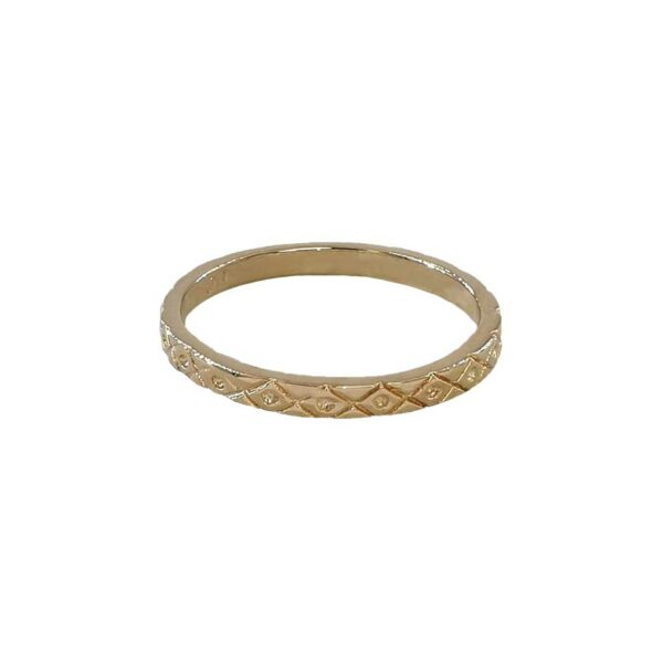 La bague Pam est réalisée en plaqué or, le travail de chaque anneau permet de réfléchir la lumière pour un effet waouh. On la porte avec des petites bagues à côté pour qu’elle ne sente pas seule.
