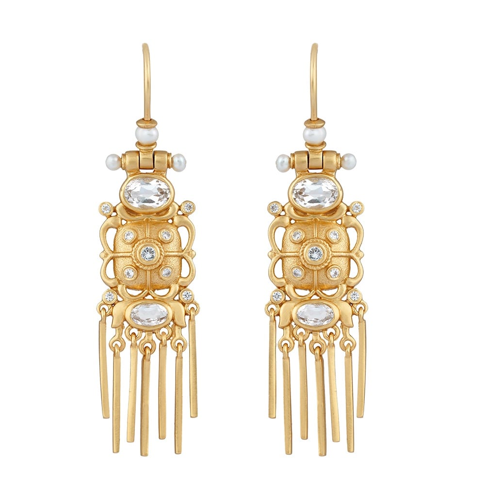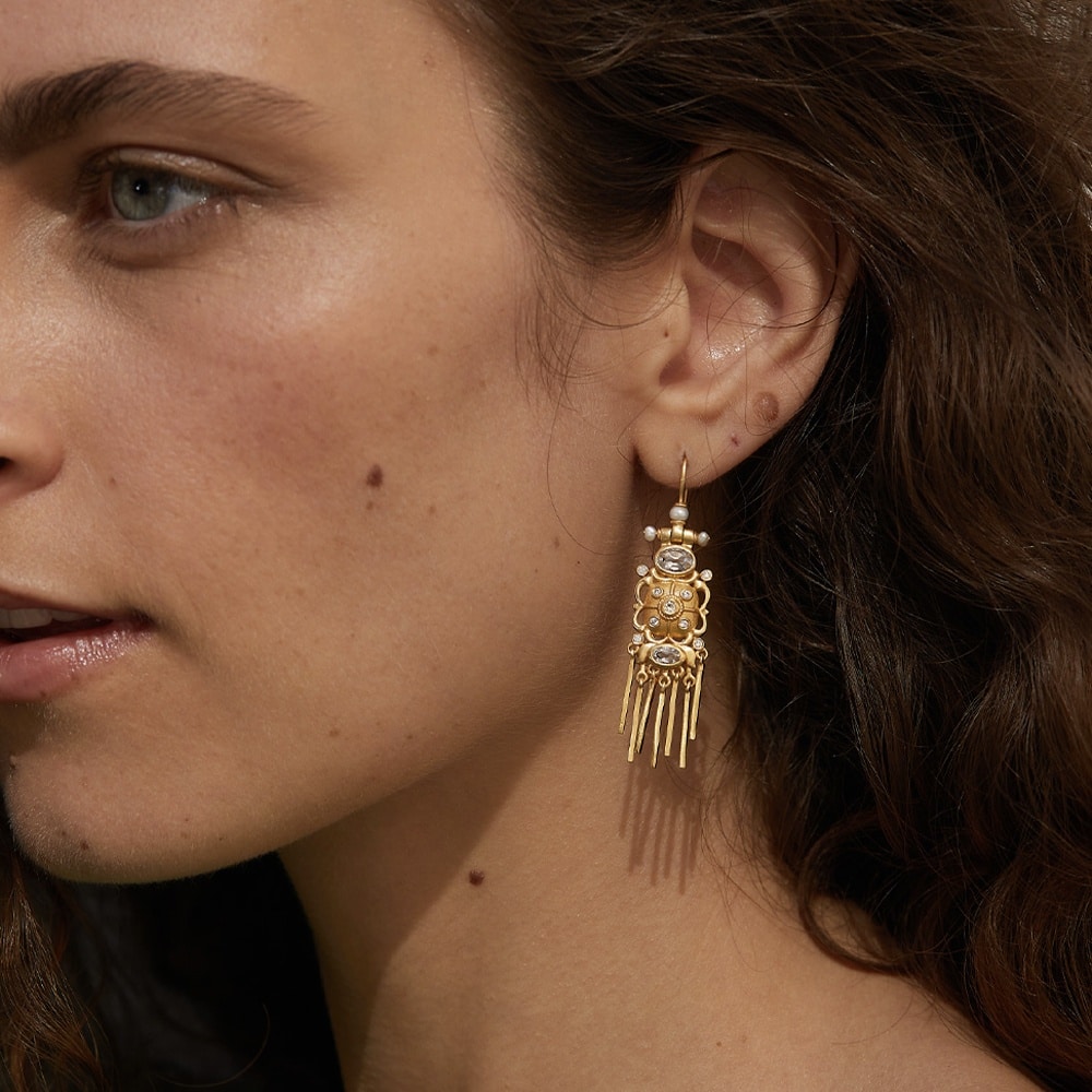Pierres : Cristal ovale facetté 4X6 mm et 3X5 mm, Topaze blanche Rondes facettée 2 mm, Zircon blanc Rondes factice 1,2 mm, Perle d’eau 2 mm et 3 mm.