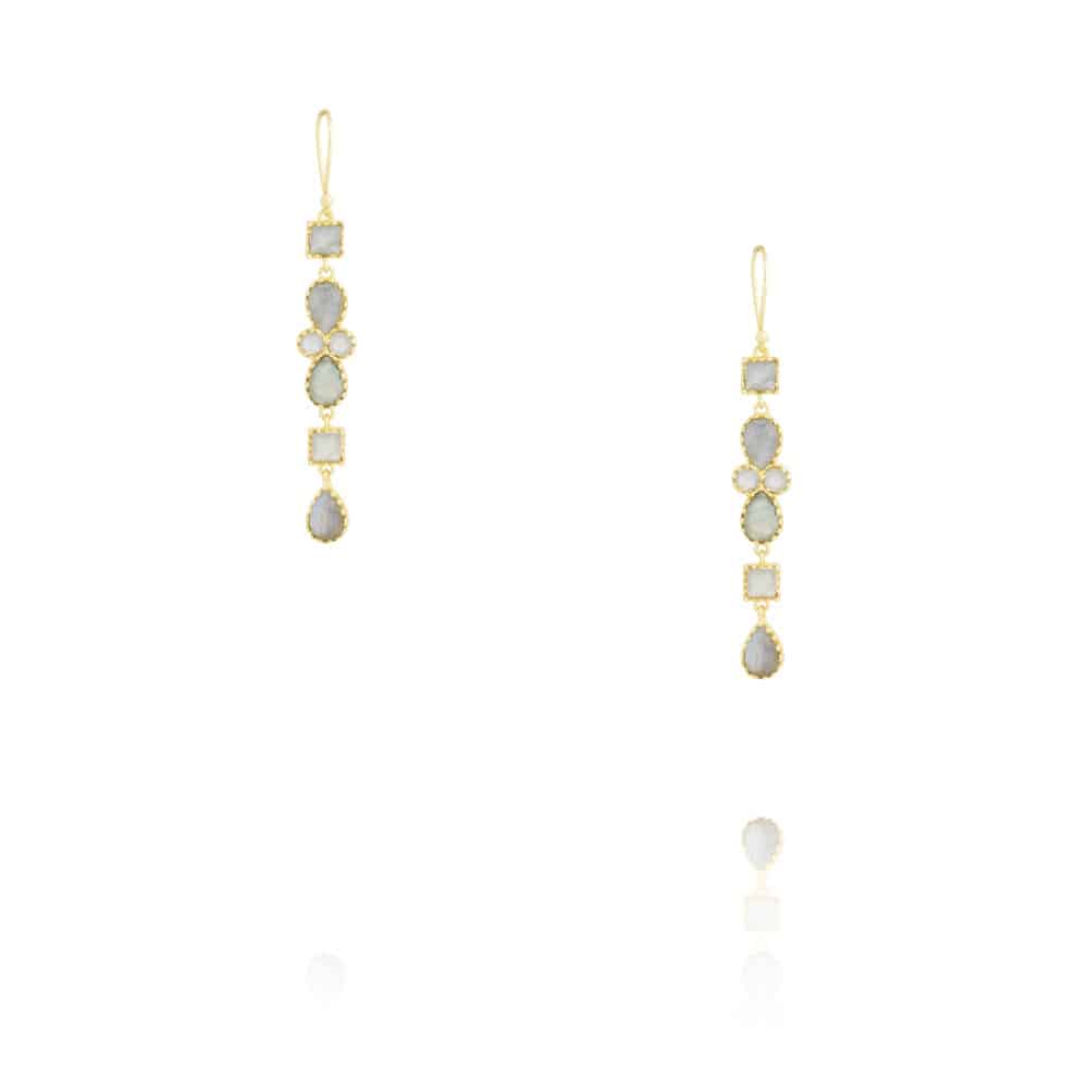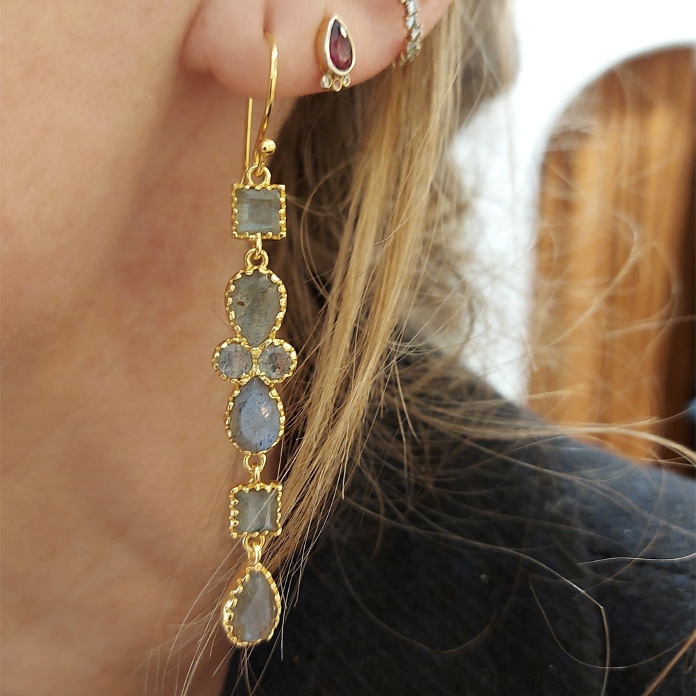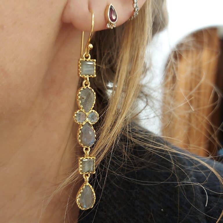 Les Boucles d’oreilles Maurya labradorite sont avec une monture en laiton doré à l’or fin. Réalisées par la créatrice de Diaperis