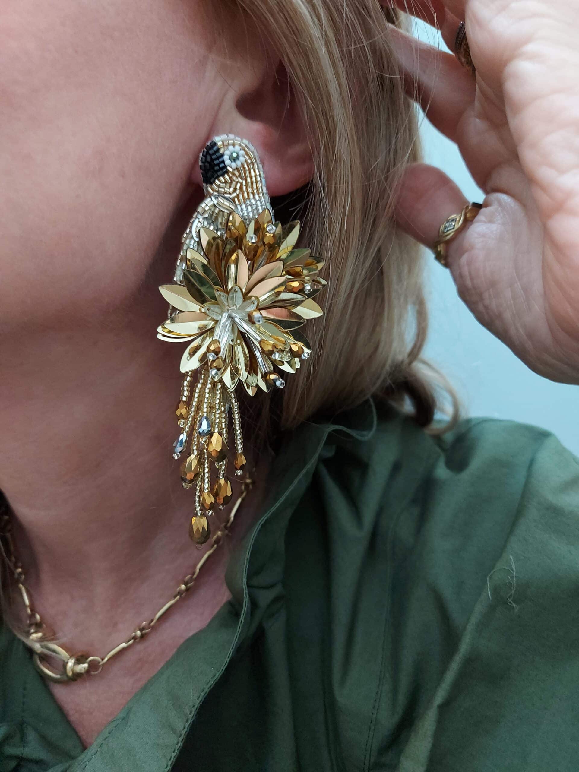 Spectaculaires et légères, les boucles Perroquet dorées incarnent l’esprit joyeux et solaire de la créatrice Olivia Dar.