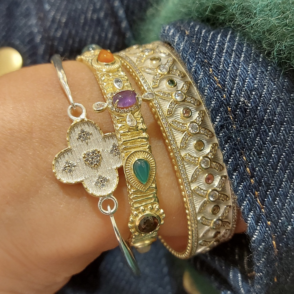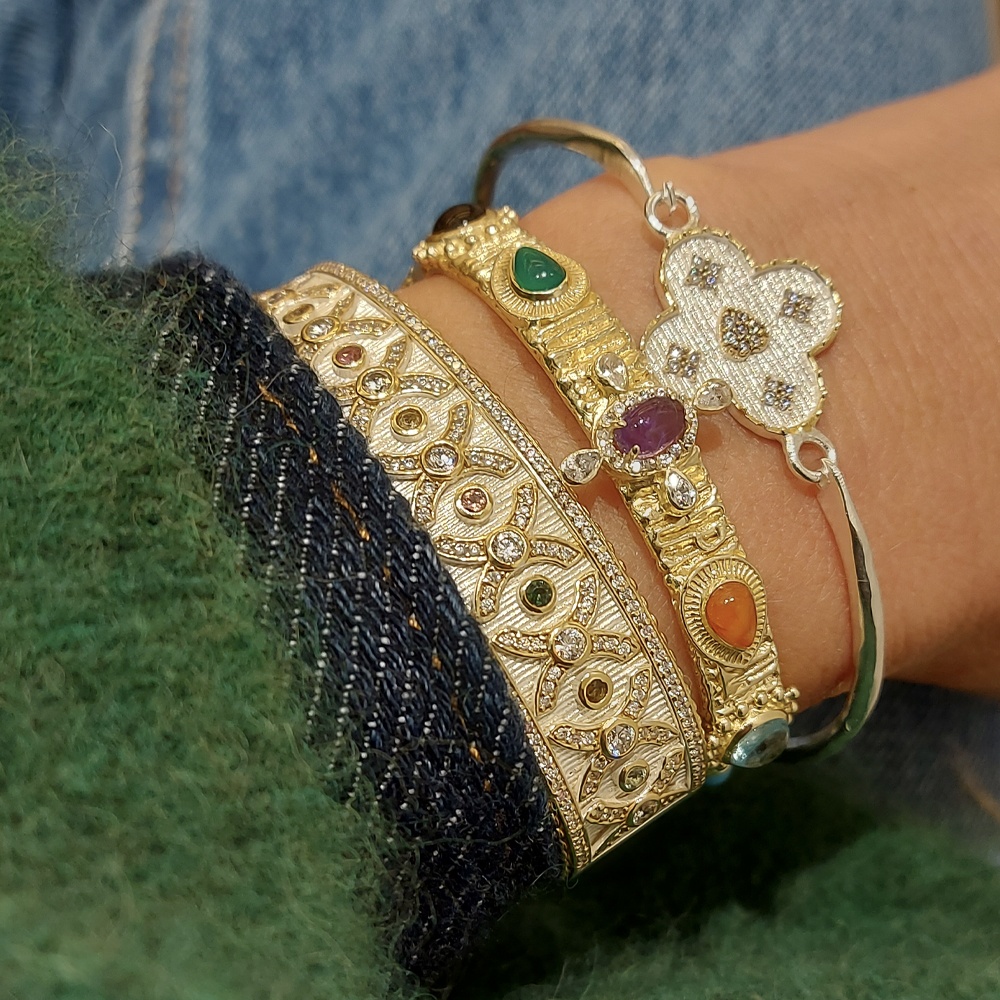 Le bracelet « Corfou » de Diaperis est une pièce audacieuse et raffinée en plaqué argent. Large et imposant, il est sublimé par des pierres naturelles de tourmaline et des zircons étincelants qui apportent une touche d’éclat et de sophistication. Le mélange de la tourmaline aux teintes vibrantes et des zircons brillants crée un contraste élégant, parfait pour habiller vos poignets avec un bijou unique. Ce bracelet est idéal pour celles qui recherchent un accessoire à la fois moderne et intemporel, qui s’adapte aussi bien aux tenues de tous les jours qu’aux occasions spéciales.