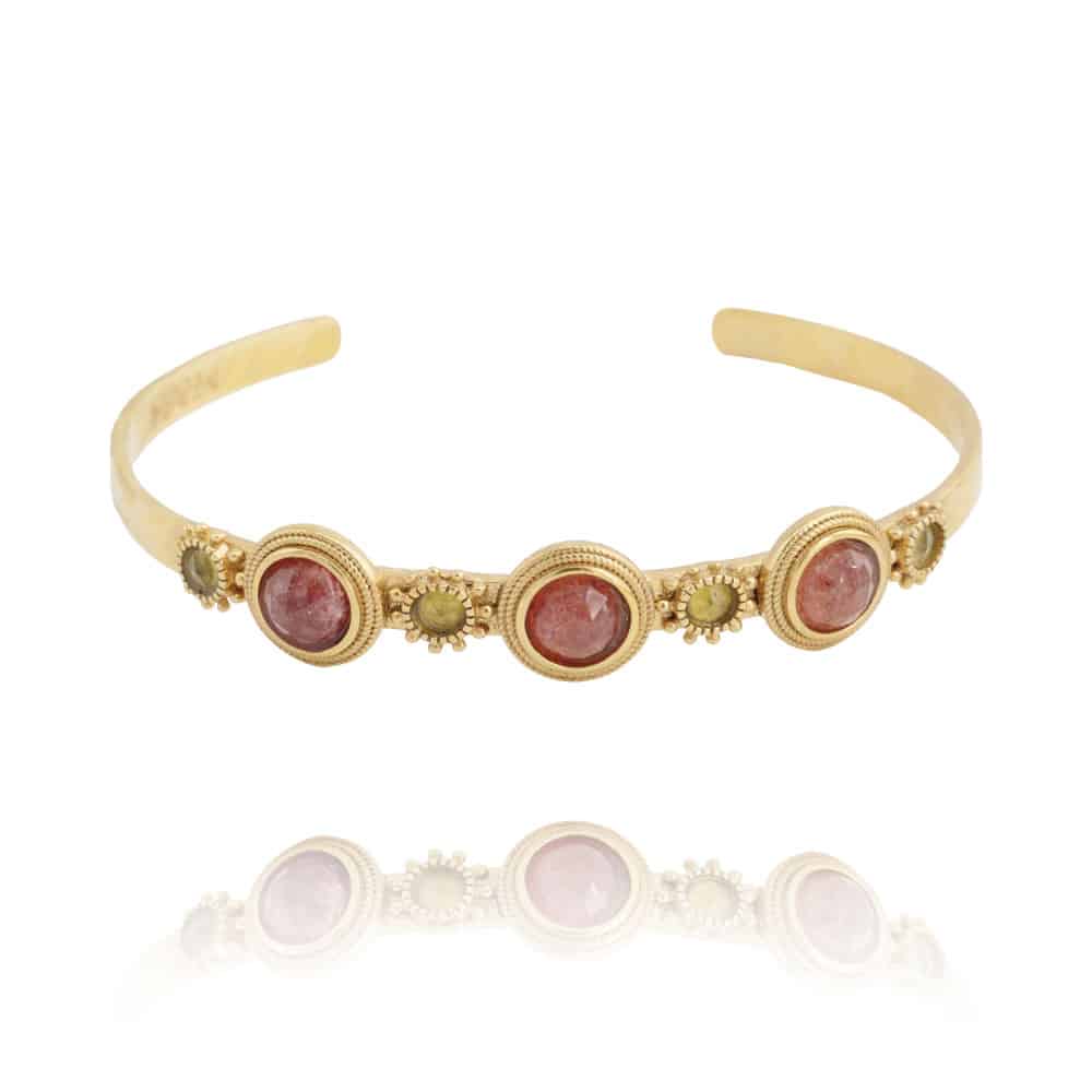 Le Bracelet jonc Jasmine quartz fraise et serpentine en laiton bain d’or, pierres naturelles et émail : magnifica ! Originale et poétique
