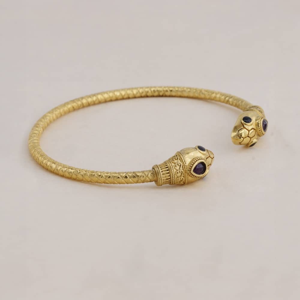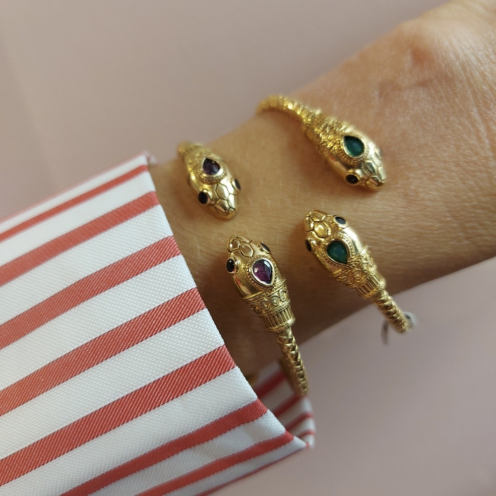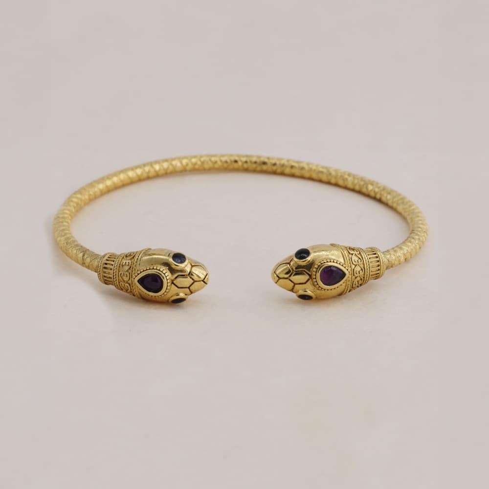 Le Bracelet jonc avec double tête de serpent, accompagné de ses pierres en grenat, en laiton bain d’or : magnifica ! Originale et poétique