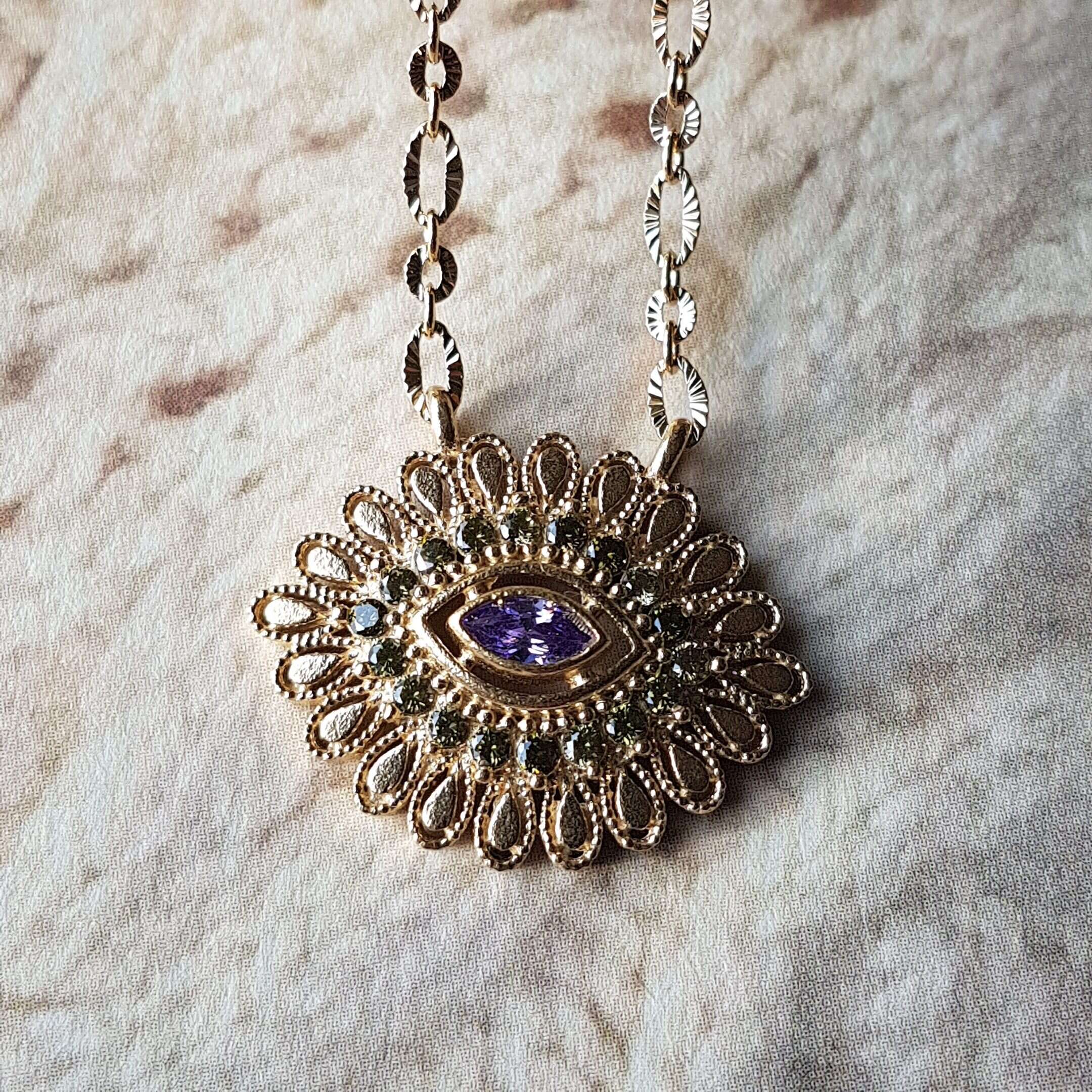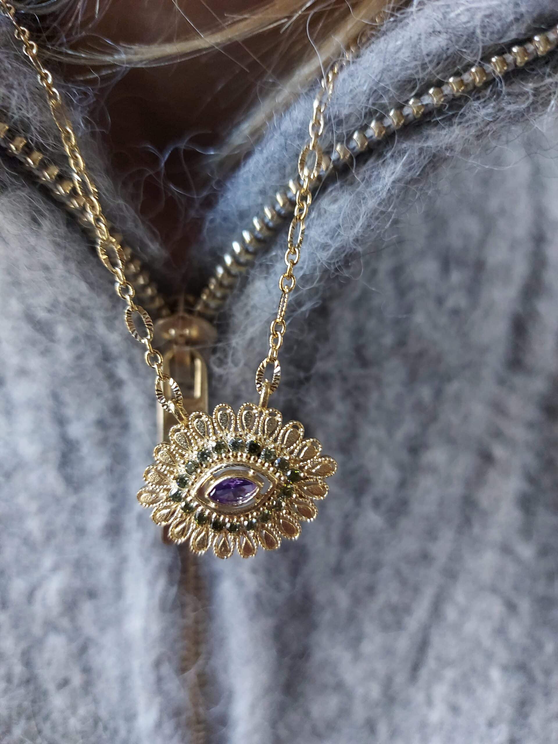 Un magnifique collier réalisé par la créatrice Virginie Berman doré à l’or 18 carats avec un fini brossé. Serti de zirconiums olive et violet. Plusieurs possibilités de compositions possibles …