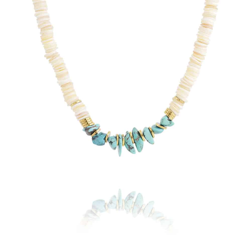 Matière : Anneaux de finition plaqué or 3 microns, Turquoise du Nevada, Turquoise du Tibet, Hématite Gold, Coquillage Teint
