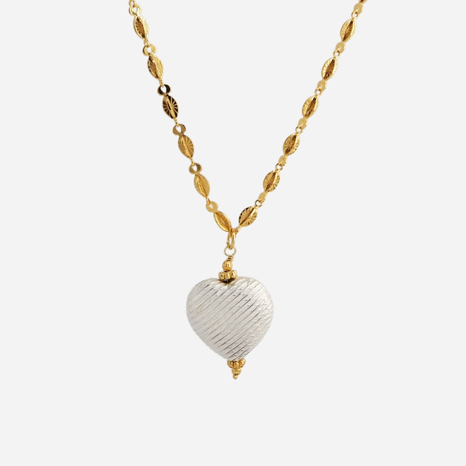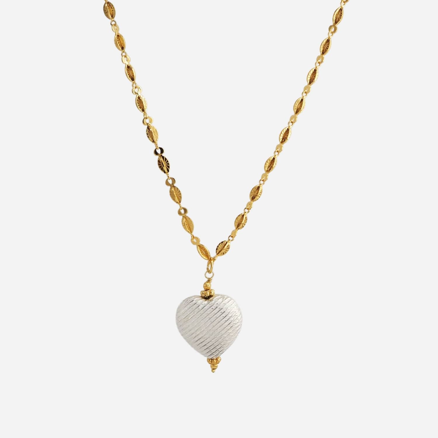 Le collier Geo de la marque Delphes Bijoux séduit par son pendentif cœur texturé au design minimaliste et raffiné. Son contraste entre doré et argenté lui donne une allure moderne et intemporelle, parfaite au quotidien.