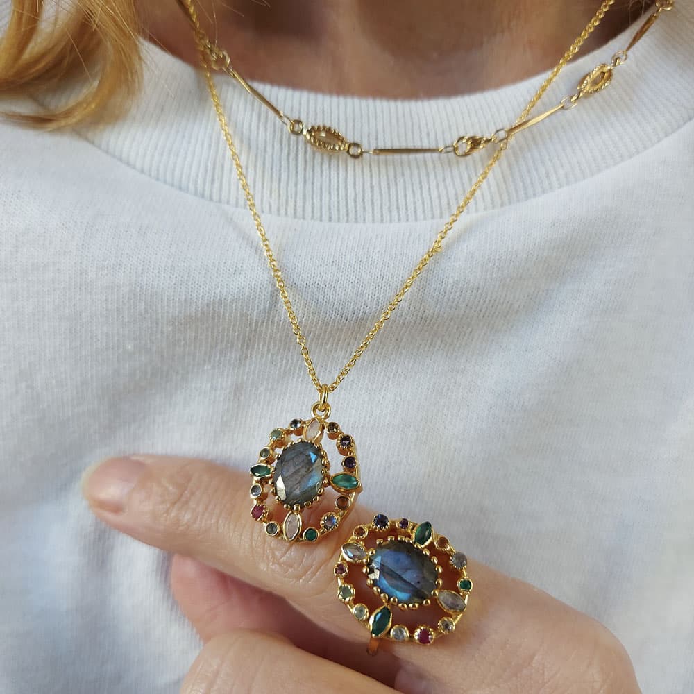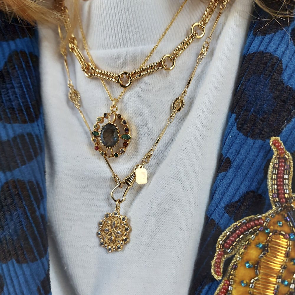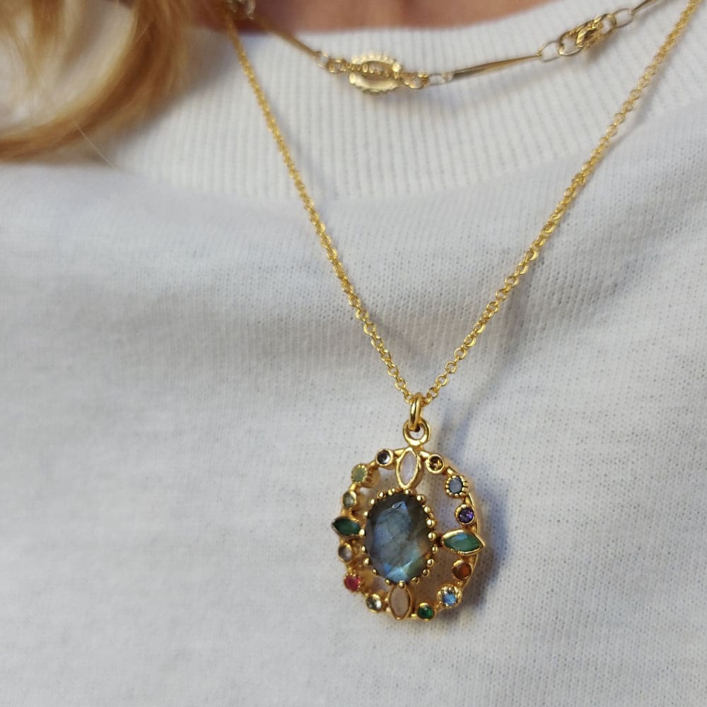 Les bijoux de la créatrice parisienne Diaperis sont réalisés dans un petit atelier indien . Le Collier Greta Labradorite multipierres est réalisé en laiton plaqué or orné de labradorite.