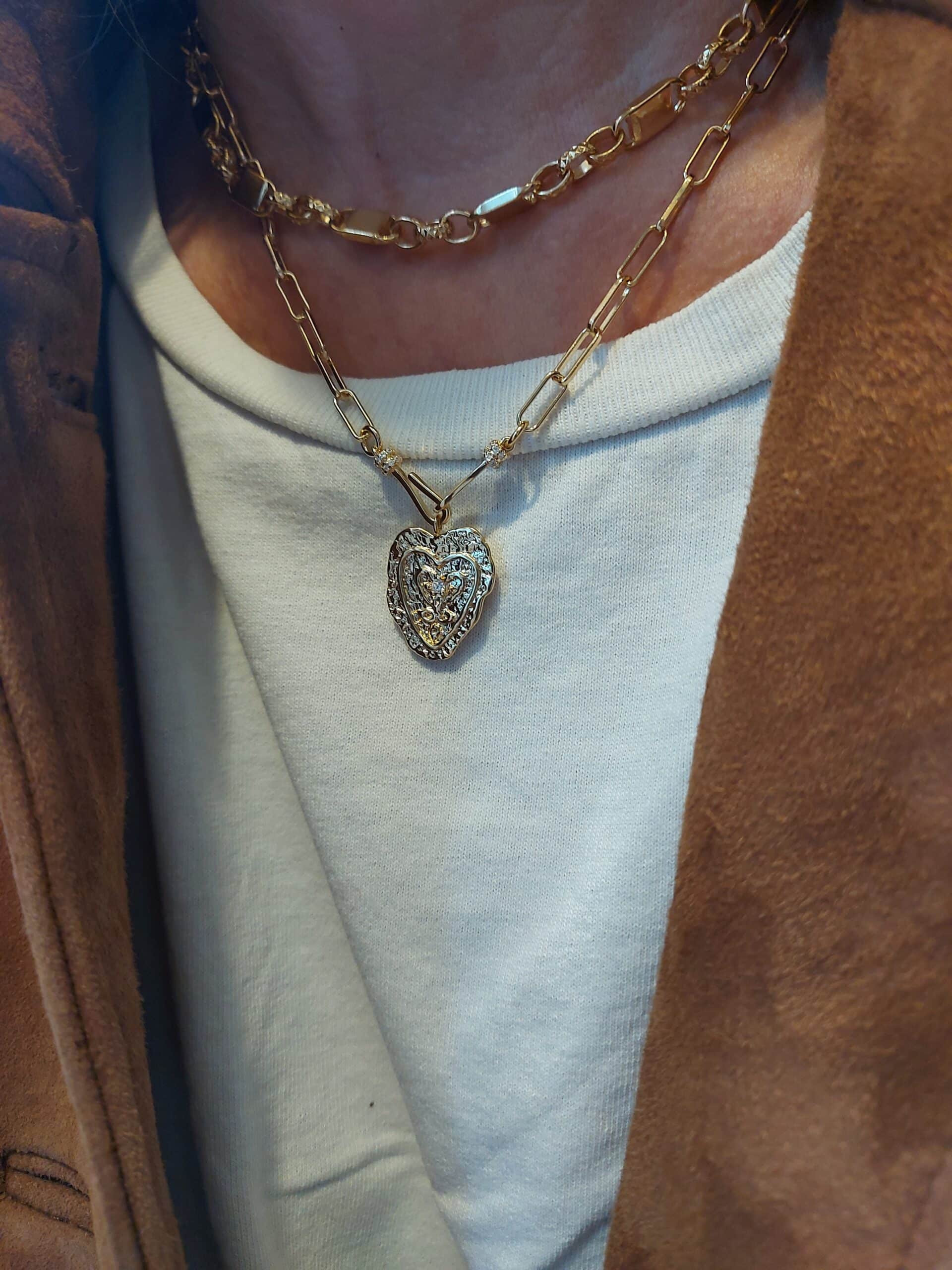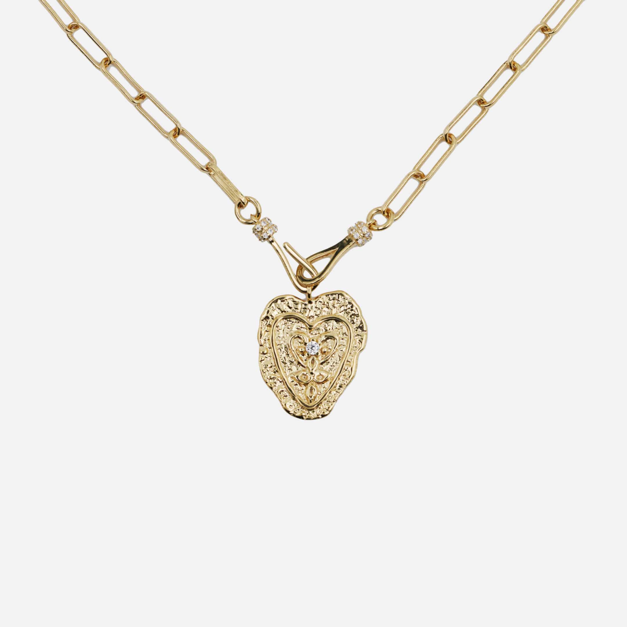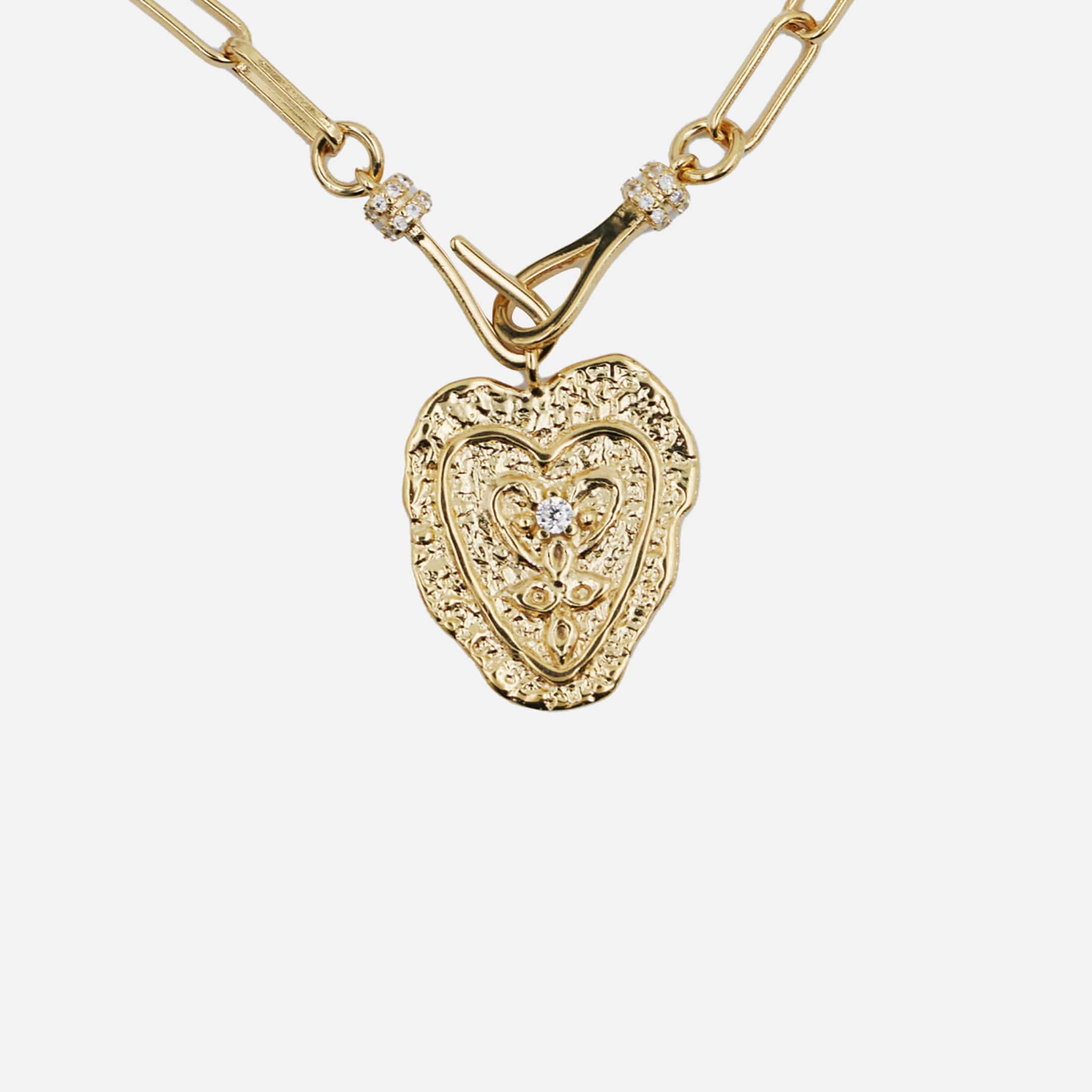 Cette pièce, sélectionnée pour son allure intemporelle, associe une chaîne maille cheval à un pendentif cœur martelé en laiton plaqué or 18 carats. Le cœur est serti d’un zircon central, ajoutant un éclat subtil et précieux. Un indispensable de la créatrice.