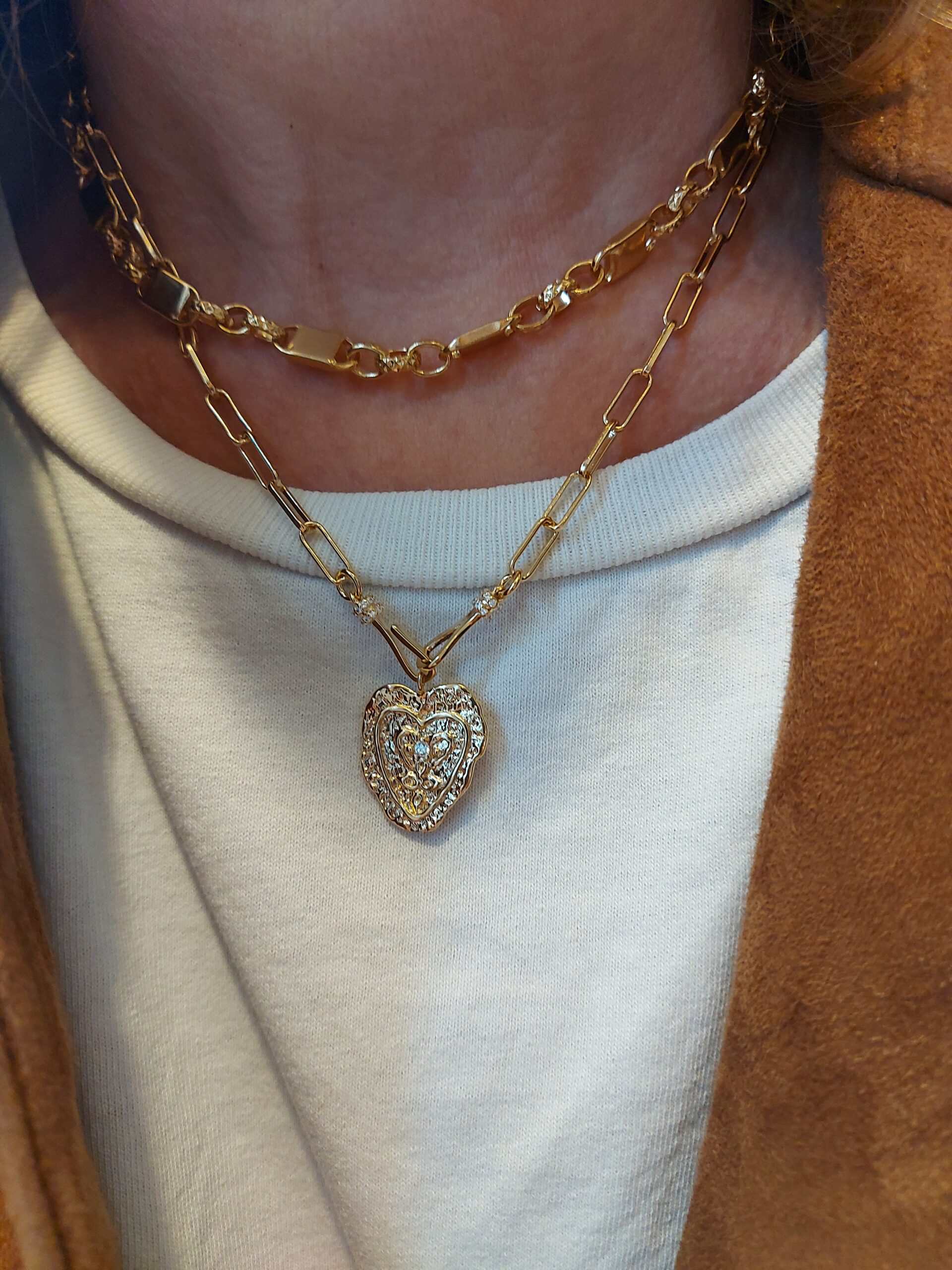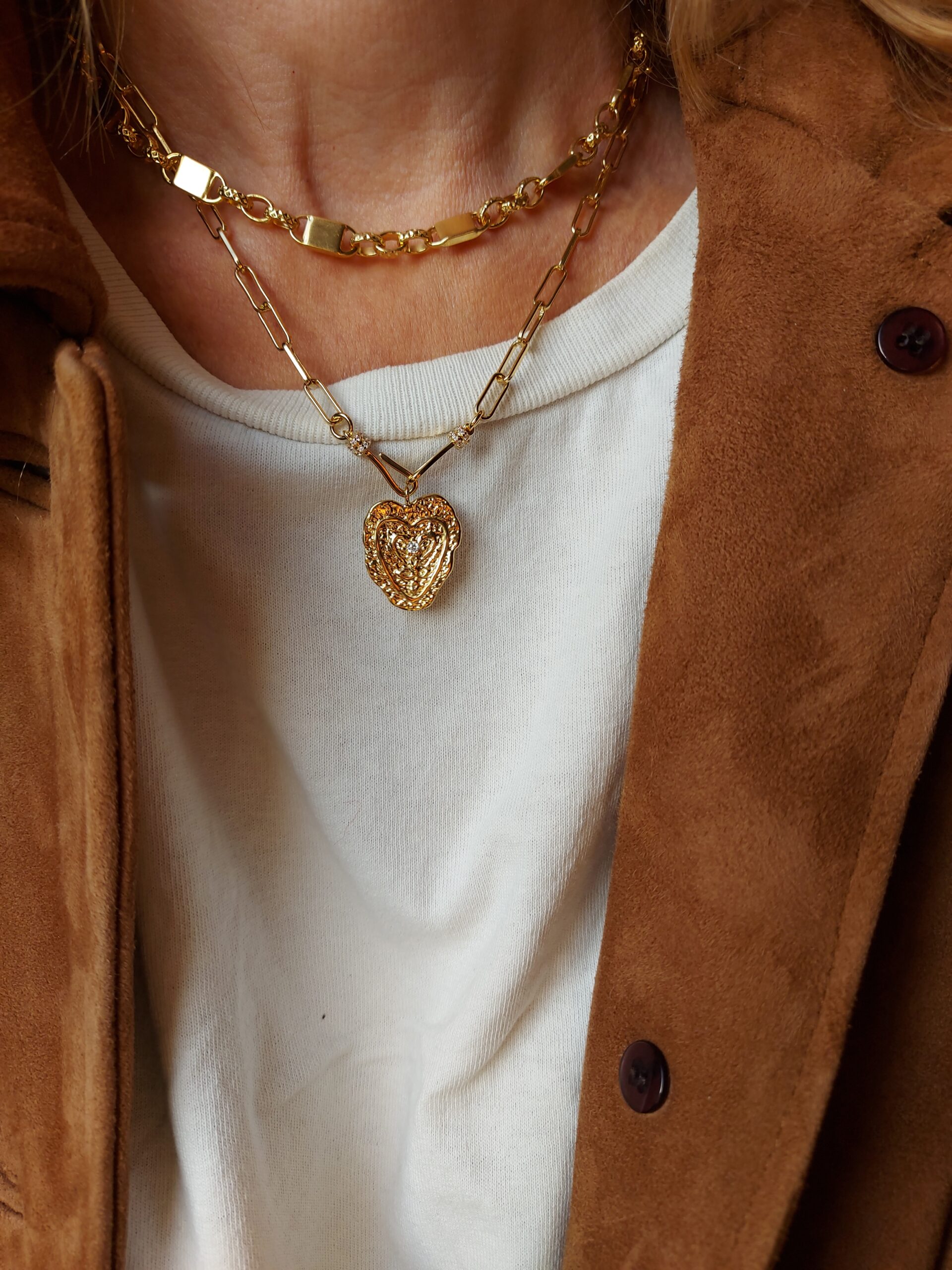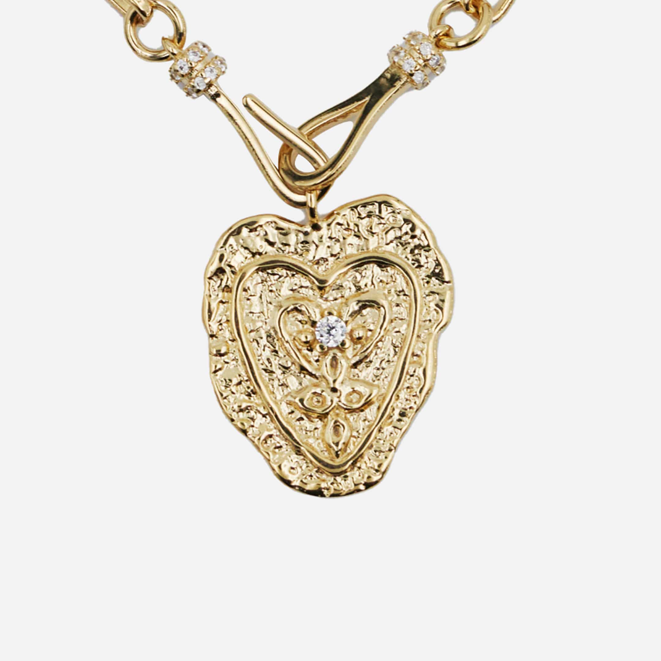 Cette pièce, sélectionnée pour son allure intemporelle, associe une chaîne maille cheval à un pendentif cœur martelé en laiton plaqué or 18 carats. Le cœur est serti d’un zircon central, ajoutant un éclat subtil et précieux. Un indispensable de la créatrice.