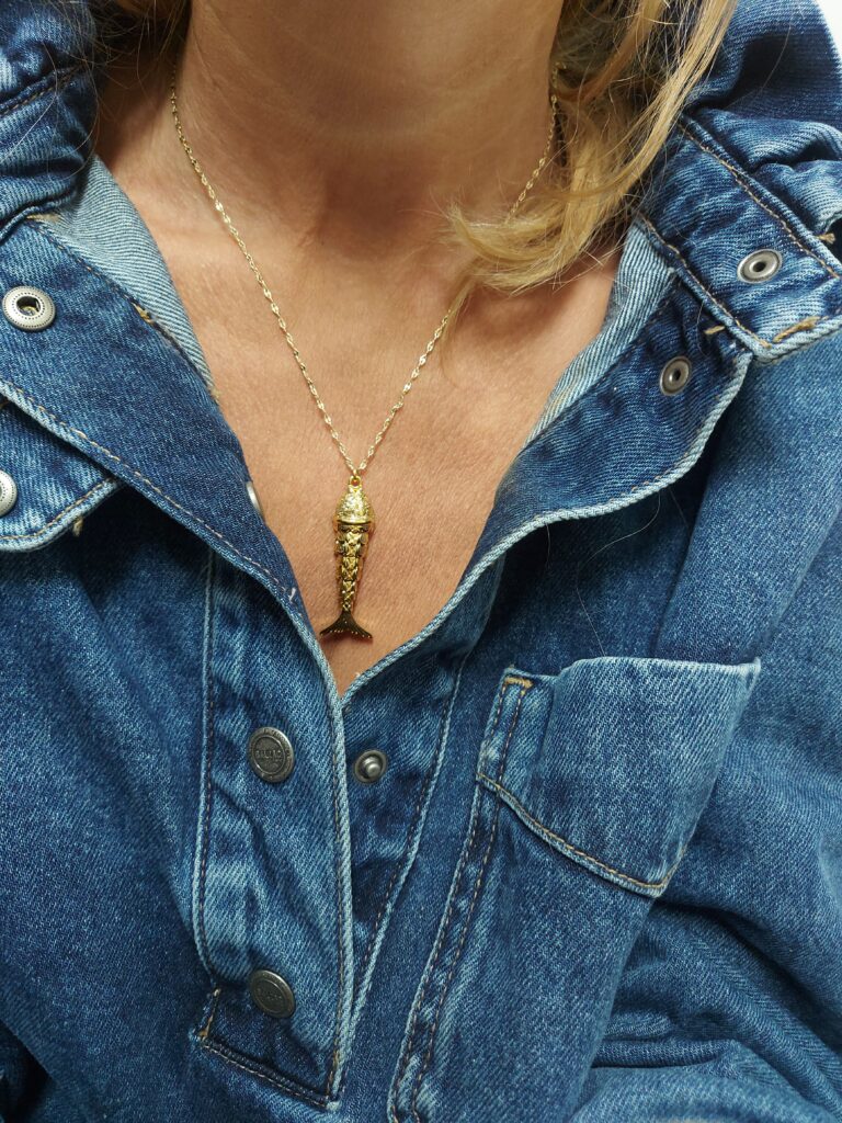 Un collier plein de fantaisie et d’élégance, sélectionné par Dolita pour son originalité. Le collier Jorgina Poisson, doré à l’or fin, se distingue par sa tête finement pailletée. Un bijou joyeux et symbolique, clin d’œil à la mer et à l’imaginaire méditerranéen.