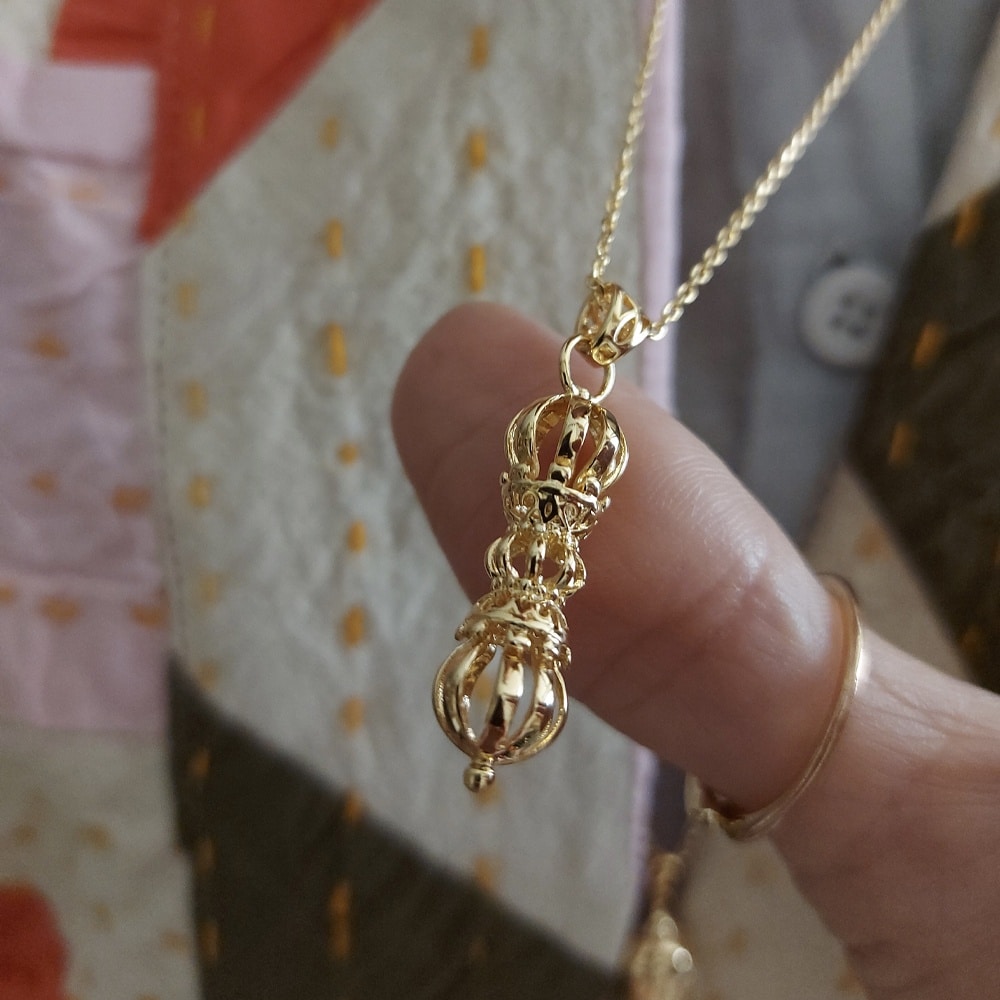 Le Vajra, un symbole important du bouddhisme, signifie « foudre » ou « Diamant ». Ce sceptre désigne la nature indestructible de l’esprit en soi et de l’Éveil, à la fois impérissable et indivisible.