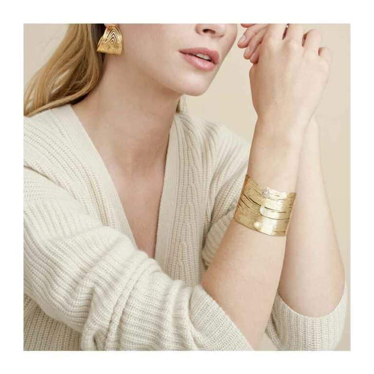 Les créoles Wave sont dorées à l’or fin 24 carats. L’inspiration provient d’un voyage en Afrique, on retrouve le style avec un assemblage de fils métallique.