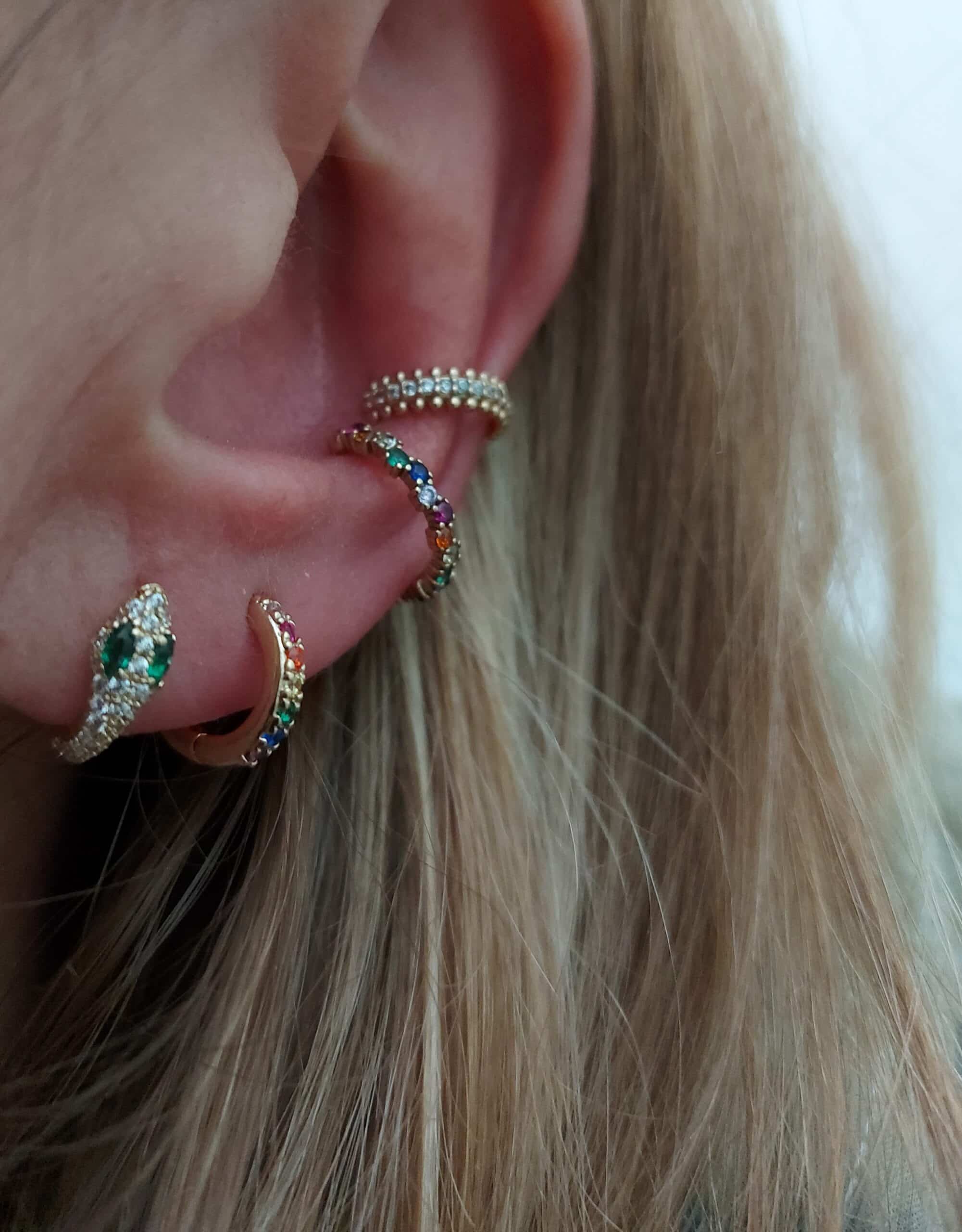 La boucle d’oreille Dana en plaqué or avec un sertissage griffes mettant en valeur les oxydes de zirconium colorés. Elles égayeront vos oreilles…