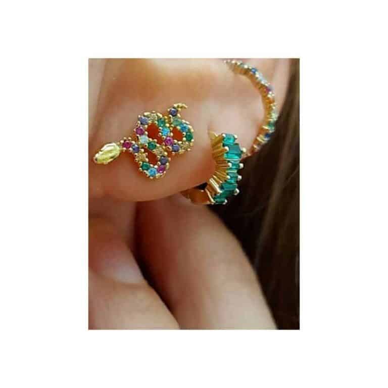 La boucle d’oreille Snake est réalisée en argent doré à l’or fin et oxydes de zirconium multico de la marque française Delphes bijoux