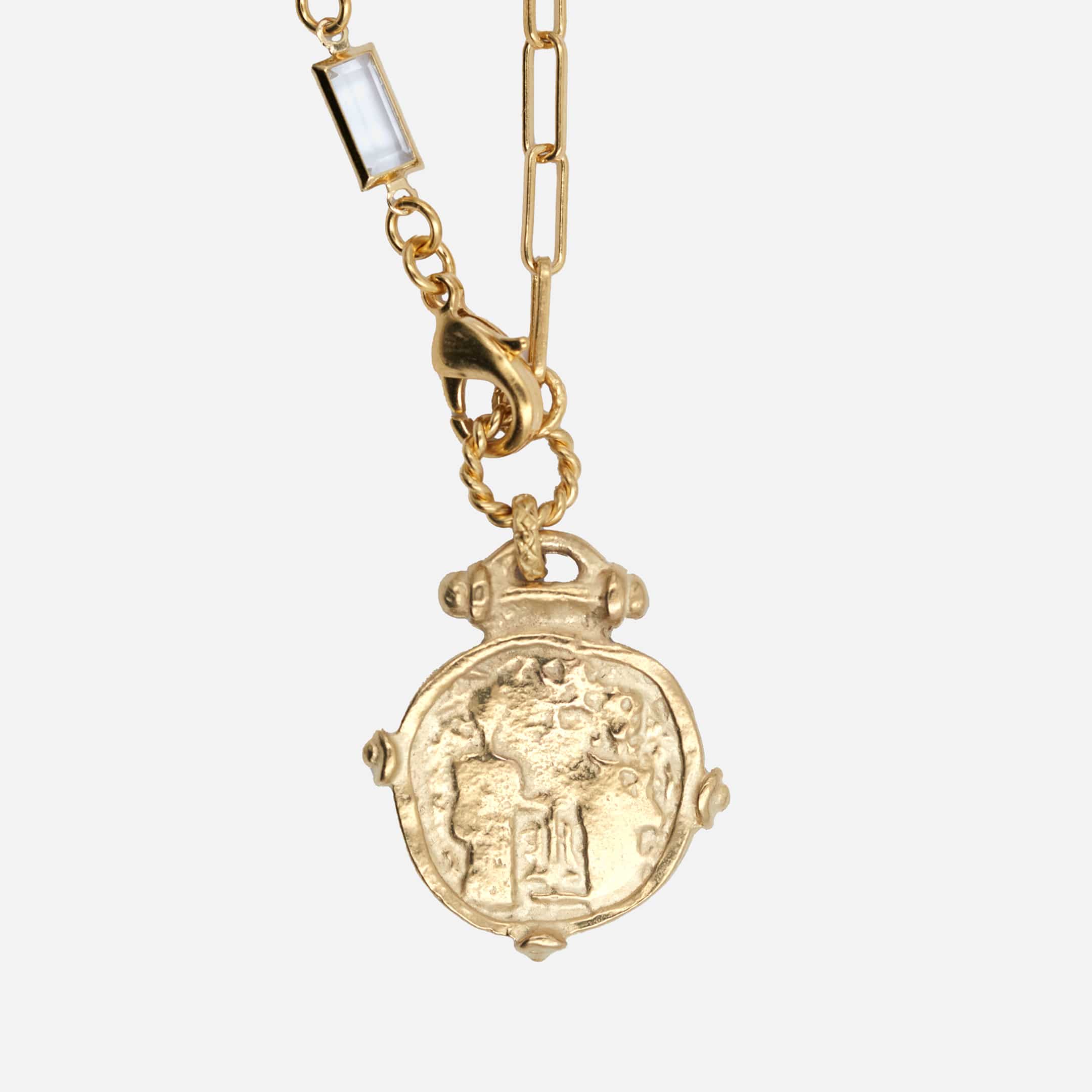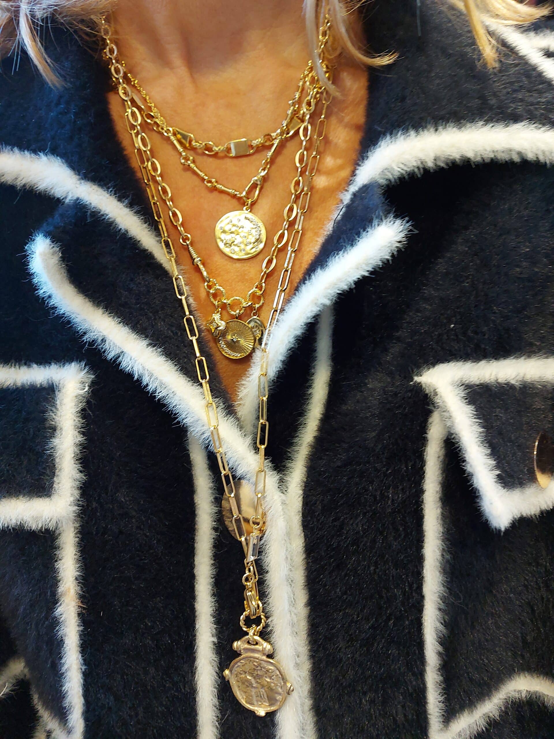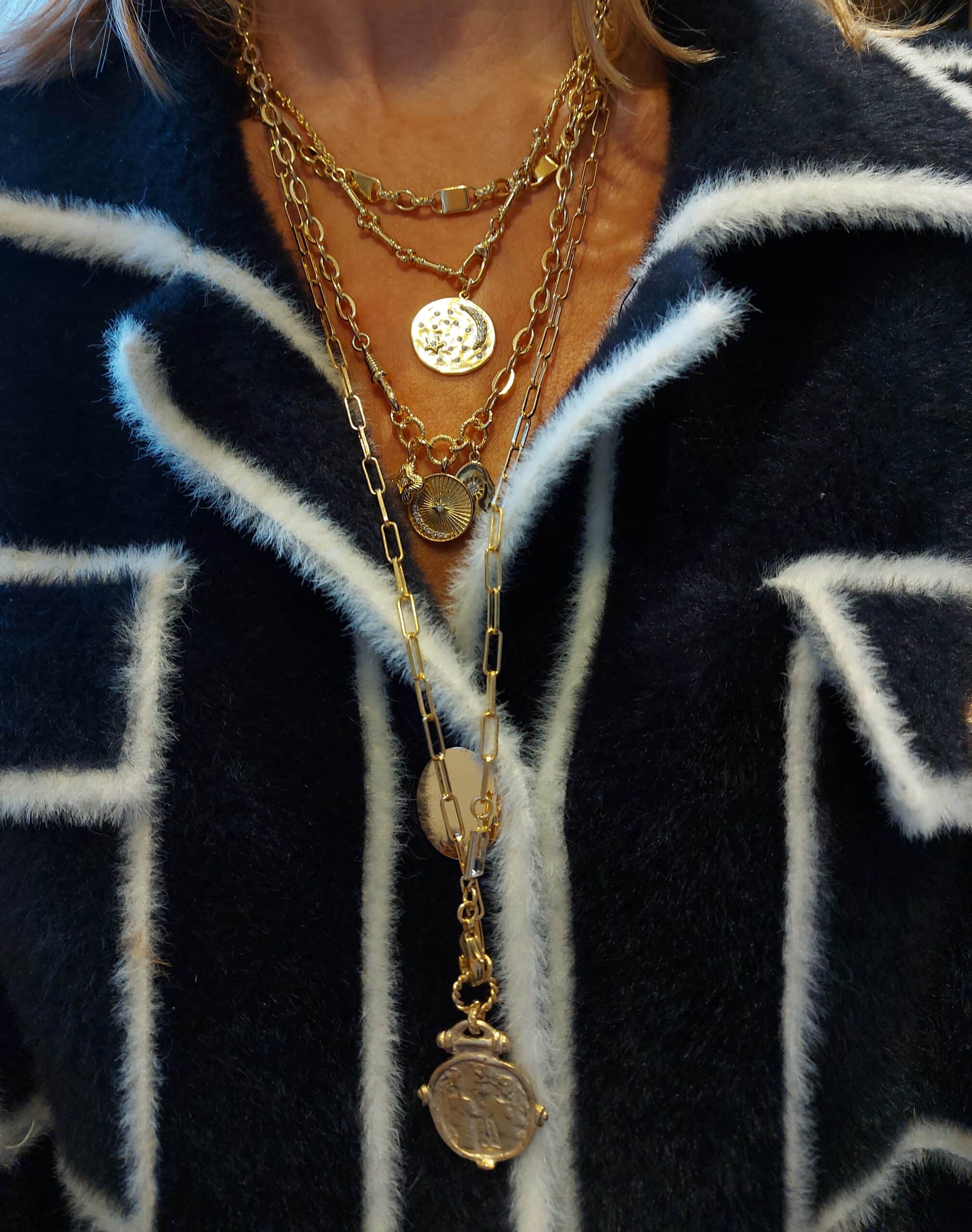 Ce sautoir, choisi par Dolita pour son allure précieuse, associe une médaille gravée façon antique à une chaîne maille cheval.