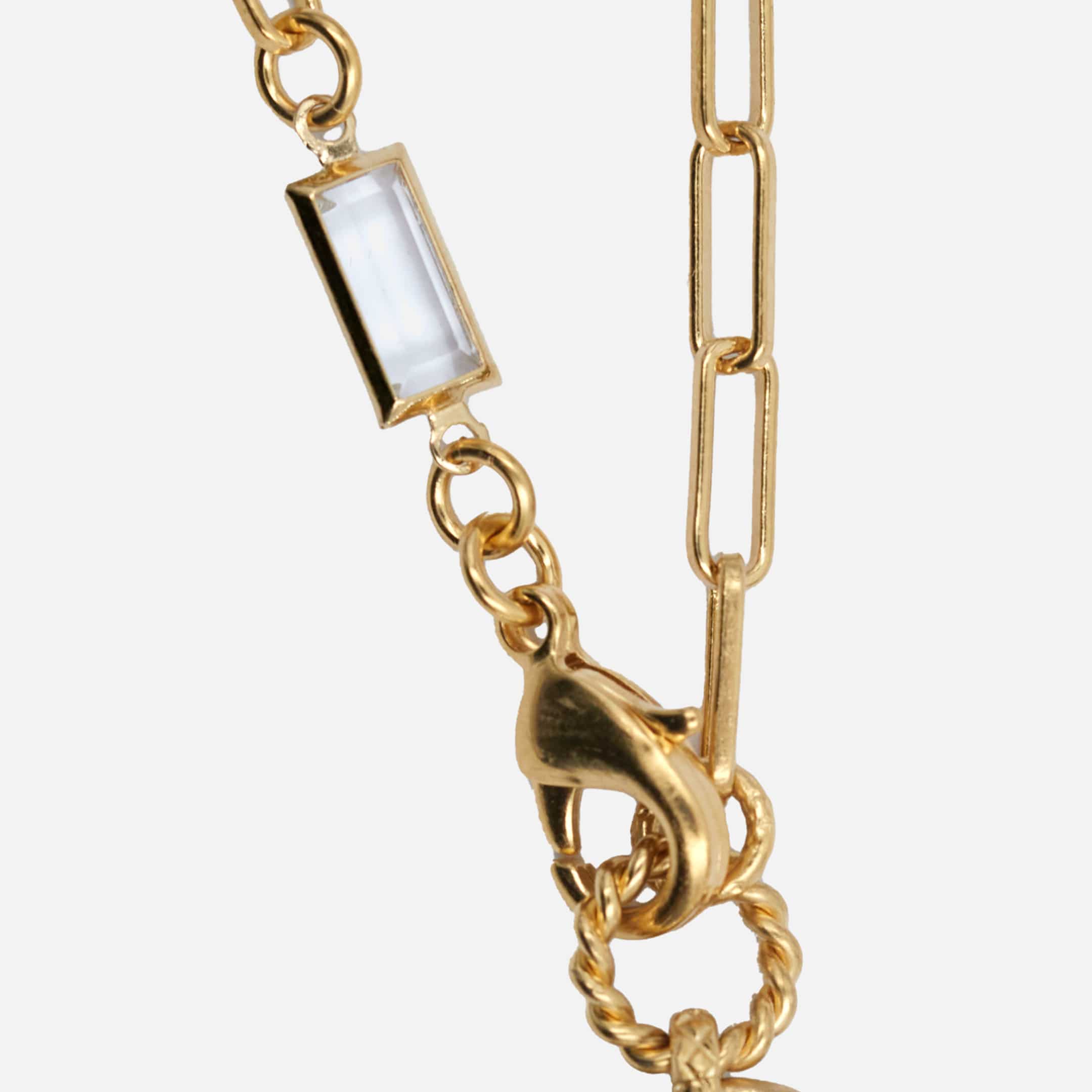 La création se distingue par un détail rare : un cristal de roche délicatement pris dans la chaîne. Un bijou talisman, élégant et solaire.