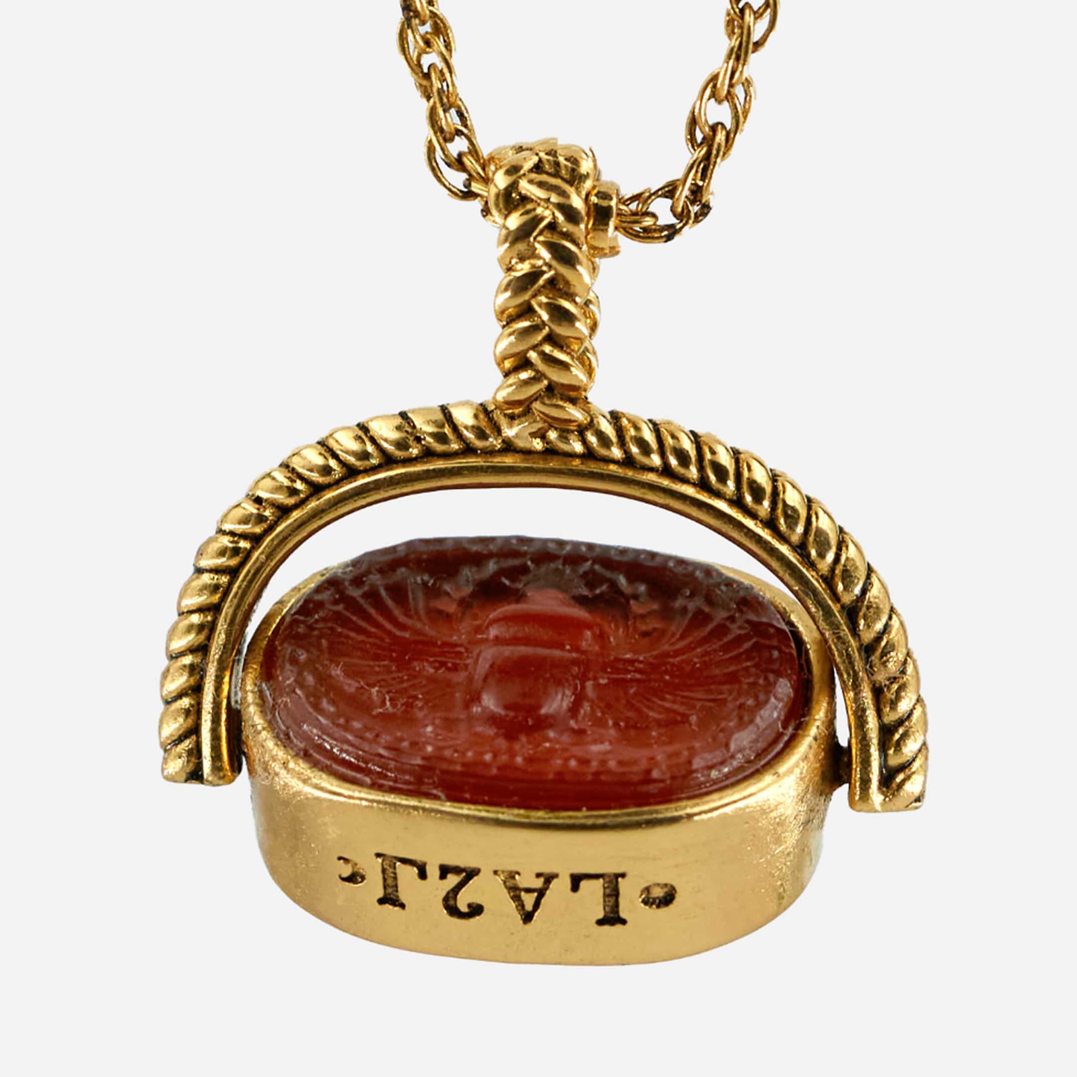 En laiton doré à l’or fin (1 micron), il s’agrémente d’une pierre taillée en Cornaline
